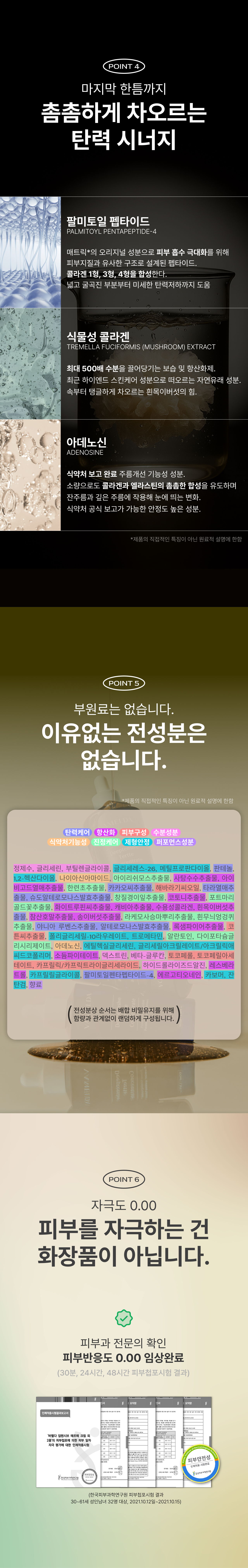 | 전성분 | 정제수, 글리세린, 부틸렌글라이콜, 글리세레스-26, 메틸프로판다이올, 판테놀, 1,2-헥산다이올, 나이아신아마이드, 아이리쉬모스추출물, 사탕수수추출물, 아이비고드열매추출물, 한련초추출물, 카카오씨추출물, 해바라기씨오일, 타라열매추출물, 슈도알테로모나스발효추출물, 창질경이잎추출물, 코토니추출물, 포트마리골드꽃추출물, 화이트루핀씨추출물, 캐비아추출물, 수용성콜라겐, 흰목이버섯추출물, 참산호말추출물, 송이버섯추출물, 라케모사승마뿌리추출물, 흰무늬엉겅퀴추출물, 야니아 루벤스추출물, 알테로모나스발효추출물, 록샘파이어추출물, 코튼씨추출물, 폴리글리세릴-10라우레이트, 트로메타민, 알란토인, 다이포타슘글리시리제이트, 아데노신, 에틸헥실글리세린, 글리세릴아크릴레이트/아크릴릭애씨드코폴리머, 소듐파이테이트, 덱스트린, 베타-글루칸, 토코페롤, 토코페릴아세테이트, 카프릴릭/카프릭트라이글리세라이드, 하이드롤라이즈드알진, 레스베라트롤, 카프릴릴글라이콜, 팔미토일펜타펩타이드-4, 에르고티오네인, 카보머, 잔탄검, 향료 | ||